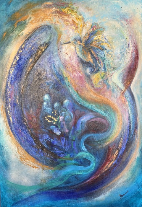 Dát wilde ik verbeelden. De kracht, de puurheid, de pijn, maar andersom ook de hoop en verlichting in onze binnenwereld. Gaandeweg de jaren besefte ik dat als ik mijn focus bleef leggen op de rug van de vrouw er veel moois uitgesloten werd en ik misschien wel letterlijk pijn in stand hield. Moest ik haar niet een keer omdraaien? Ik ontwikkelde een nieuwe stijl in mijn schilderkunst waar vrouwen een belangrijke rol in blijven spelen. Geen realistische beelden, maar beelden vol kleur, beweging en vrouwelijkheid, vertaald uit mijn binnenwereld om de buitenwereld te inspireren dat de juiste beweging volgt als je jouw pure zelf laat zien. Daar waar je écht blij van wordt, geluk van binnenuit. Van puurheid, passie en zachtheid, maar ook kracht en de flow in het leven die volgt als jij je hart volgt.
